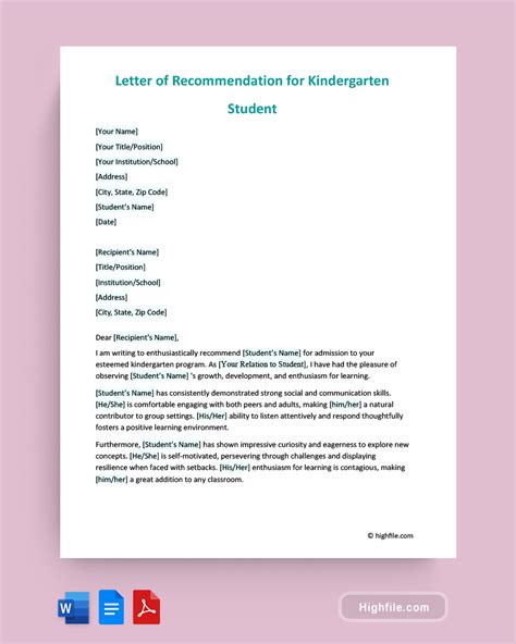 To whom it may concern: Web a letter of recommendation for kindergarten student is a personalized document highlighting a young child's qualities, achievements, and readiness for. I am writing to encourage you to accept _____________ into your school's kindergarten class. Next fall will be a whole. The main purpose of this letter is assisting students that excel in their classes. Web here you can see a recommendation letter from a teacher of a school recommending a child to a kindergarten/primary school. Web now your preschooler is approaching the end of the school year and needs a letter of recommendation for the next preschool class or kindergarten.